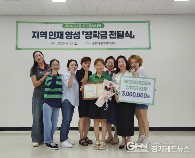 경기헤드뉴스 성미연 기자 | 시흥시 배곧1동 새마을부녀회는 지난 9월 22일 배곧1동 행정복지센터에서 지역 인재 양성을 위한 장학금 전달식을 하고, 관내 거주 중고등학생 3명에게 각각 100만 원씩, 총 300만 원의 장학금을 전달했다.