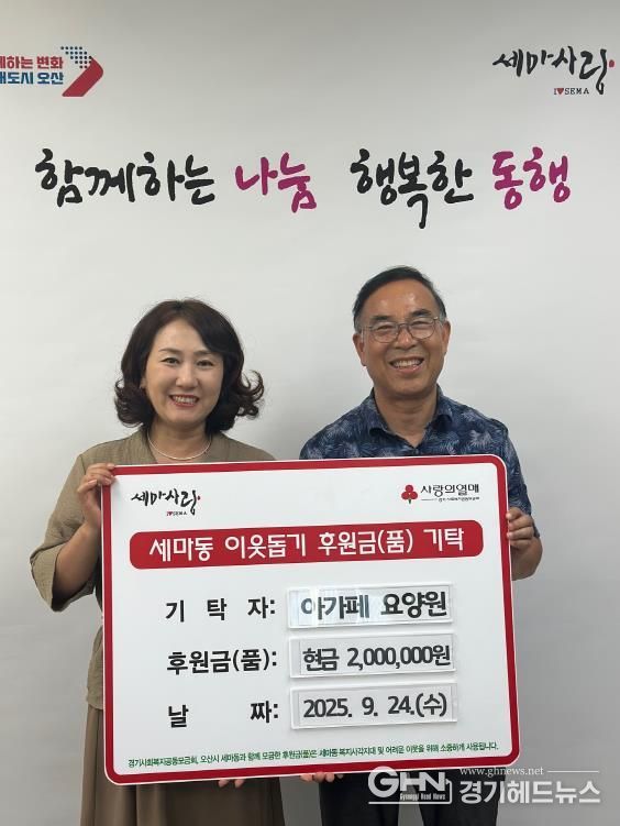 경기헤드뉴스 성미연 기자 | 오산시 세마동은 지난 24일 아가페 요양원에서 지역 내 저소득 취약계층을 돕기 위한 성금을 기탁했다고 밝혔다.