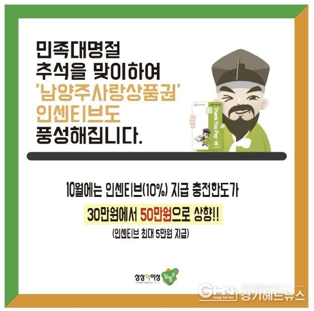 경기헤드뉴스 성미연 기자 | 남양주시는 추석을 맞아 위축된 소비심리 회복과 지역 내 소비 촉진을 위해 10월 한 달간 남양주사랑상품권 인센티브 충전 한도를 기존 월 30만 원에서 50만 원으로 상향한다고 25일 밝혔다.