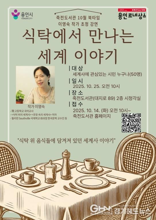 경기헤드뉴스 성미연 기자 | 용인특례시는 25일 오전 10시 죽전도서관 시청각실에서 죽전도서관 북타임 작가초청강연회 ‘식탁에서 만나는 세계 이야기’를 연다고 13일 밝혔다.