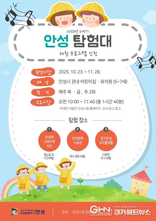 경기헤드뉴스 성미연 기자 | 안성시는 상반기에 시범 운영해 큰 호응을 얻은 유아 대상 체험형 프로그램 ‘안성 탐험대: 역사 속으로, 음악 속으로!’를 하반기에도 운영하며, 지역 문화시설 활성화에 나선다.