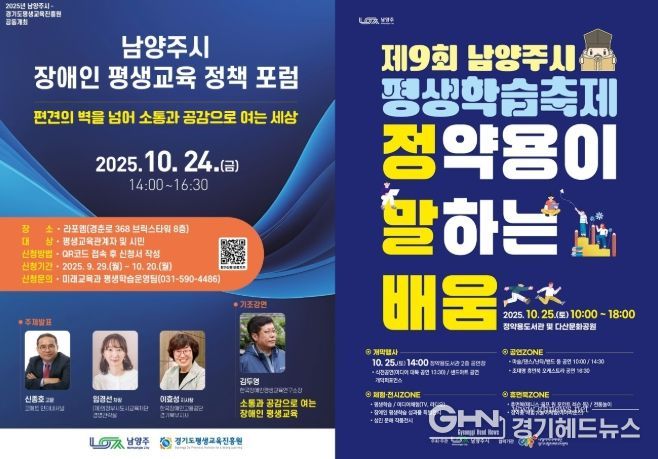 경기헤드뉴스 성미연 기자 | 남양주시는 장애인과 비장애인이 함께 어우러지는 평생학습 환경 조성과 모두를 위한 평생학습 가치공유 및 활성화를 위해 오는 24일 ‘장애인 평생학습포럼’, 25일 ‘평생학습축제’를 연이어 개최한다고 밝혔다.