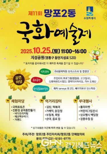 경기헤드뉴스 성미연 기자 | 수원시 영통구 망포2동 주민자치회는 오는 10월 25일, 영통구 지성공원에서 제11회 국화예술제를 개최한다. 태장동부터 이어져온 이번 축제는 지역주민이 함께 어울리고 즐길 수 있는 참여형 문화행사로 국화포토존, 친환경 공예품만들기 체험부스, 먹거리 장터, 플리마켓 등 다채로운 프로그램이 마련될 예정이다.