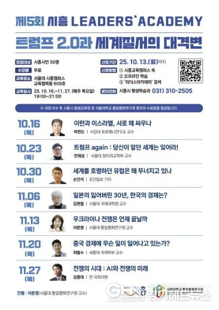 경기헤드뉴스 성미연 기자 | 시흥시는 서울대학교 본부 직속 연구기관인 통일평화연구원과 함께 '제5회 시흥리더스아카데미'를 10월 16일에 개강한다. 이번 아카데미는 '트럼프 2.0과 세계질서의 대격변'을 주제로 급변하는 국제 정세와 세계 질서의 흐름에 대한 시민들의 폭넓은 이해를 돕고자 마련됐다.