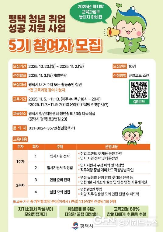 경기헤드뉴스 성미연 기자 | 평택시는 관내 청년들의 취업역량 강화를 위해 추진 중인 ‘평택 청년 취업 성공 지원사업’의 5기 교육생을 10월 20일부터 11월 2일까지 모집한다고 밝혔다.