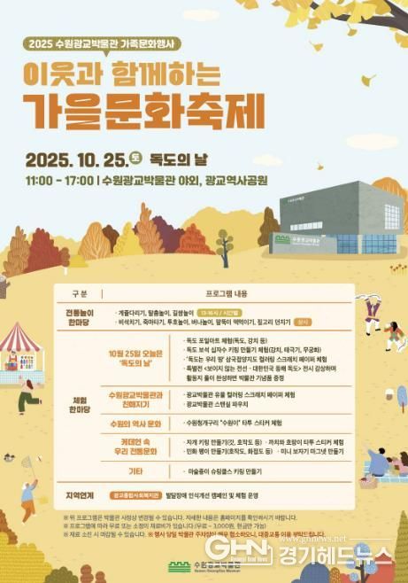 경기헤드뉴스 임수연 기자 | 수원광교박물관은 독도의 날인 10월 25일 오전 11시부터 오후 5시까지 수원광교박물관 야외(광교역사공원)에서 ‘2025 수원광교박물관 가족문화행사–이웃과 함께하는 가을문화축제’를 연다.