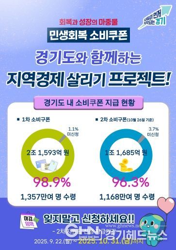 한편 경기도의 지난 1차 소비쿠폰의 지급률은 98.9%로 1,357만여 명이 소비쿠폰 2조 1,593억 원을 수령한 바 있으며, 26일 현재 1차와 2차를 거쳐 지급된 소비쿠폰(약 3조 3,275억 원)의 91.5%가 사용된 것으로 나타났다.