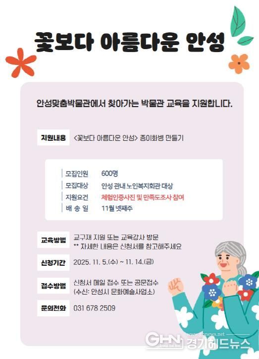 경기헤드뉴스 성미연 기자 | 안성시 안성맞춤박물관은 지역 내 문화 소외계층의 문화 향유 기회를 확대하기 위해 '안성맞춤박물관 찾아가는 박물관 교육'을 오는 11월 5일부터 11월 14일까지 신청받는다.