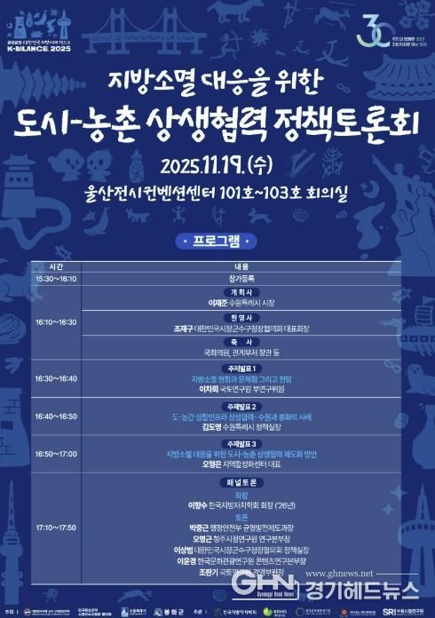 수원특례시(시장 이재준)는 11월 19일 오후 4시 울산전시컨벤션센터 1층에서 ‘지방소멸 대응을 위한 도시–농촌 상생협력 정책토론회’를 개최한다.