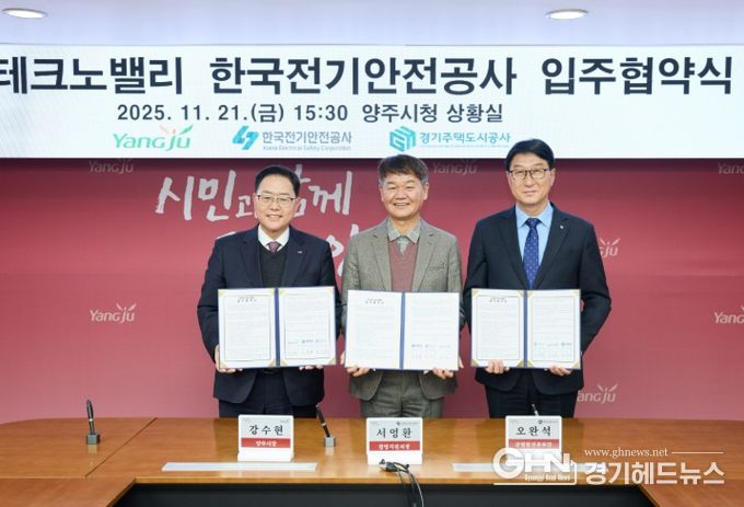 경기헤드뉴스 성미연 기자 | 경기주택도시공사(GH)는 21일 양주시청 상황실에서 양주시, 한국전기안전공사와 함께 ‘한국전기안전공사 북부지역본부’의 경기양주 테크노밸리 입주를 위한 협약식을 체결했다고 밝혔다.