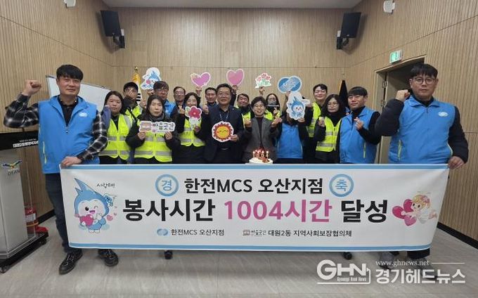 경기헤드뉴스 임수연 기자 | 오산시 대원2동 지역사회보장협의체는 지난 4일 한전MCS 오산지점과 함께 봉사 누적 1004시간 달성 기념행사를 개최하고, 그동안 지역 곳곳에서 꾸준히 나눔을 실천해 온 직원들의 노고를 격려하는 뜻깊은 시간을 가졌다. 이번 성과는 단기간의 활동이 아닌 지속적인 민·관 협력과 꾸준한 연계로 이뤄낸 결실로, 지역사회에서도 큰 의미를 지닌다.