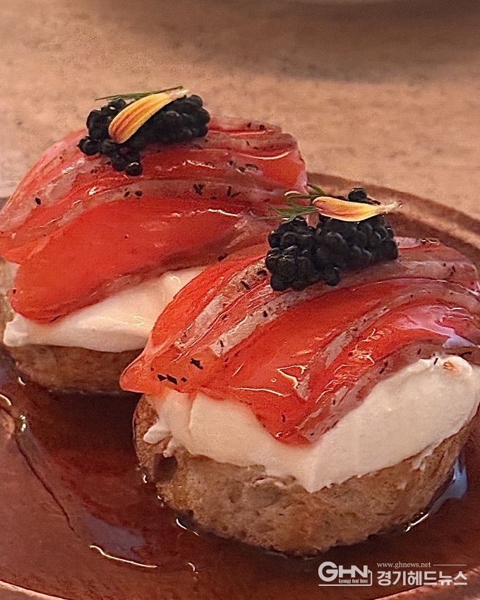 고운 색감의 연어가 얇게 슬라이스되어 부드럽게 입 안을 감싸고, 산뜻한 크림과 감귤 계열의 향이 가볍게 균형을 잡아준다.
