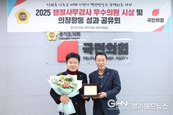 경기헤드뉴스 성미연 기자 | 문병근 경기도의회 건설교통위원회 부위원장(국민의힘, 수원11)이 12일 경기도의회 국민의힘 회의실에서 열린 '2025 행정사무감사 우수의원 시상식 및 의정활동 성과 공유회'에서 ‘행정사무감사 우수의원’에 선정됐다. 이번 시상식은 행정사무감사를 통해 도민 중심의 정책 대안을 제시하고, 도정 전반의 운영을 꼼꼼히 살핀 의원들을 격려하기 위해 마련됐다.