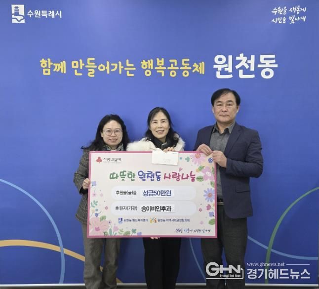 경기헤드뉴스 권준형 기자 | 지난 18일, 원천동에 소재한 송이비인후과는 지역사회 나눔 실천의 일환으로 원천동행정복지센터에 성금 50만 원을 기부했다.