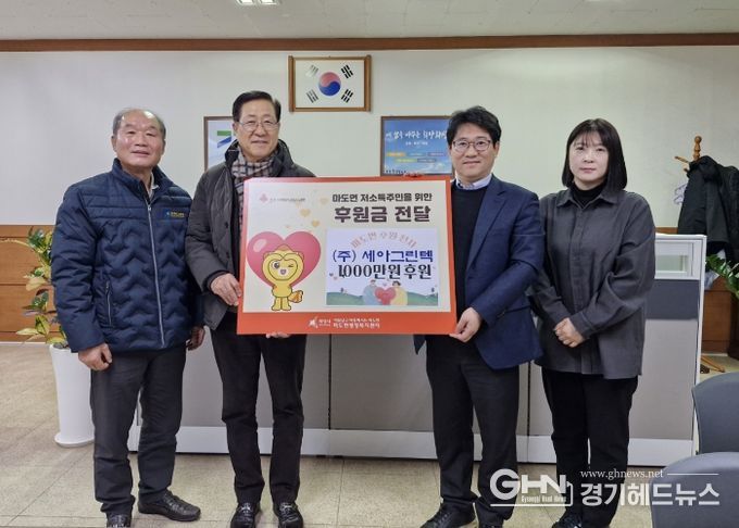 기부금 전달식은 마도면 행정복지센터에서 열렸으며, 김정우 마도면장과 윤수현 세아그린텍 대표를 비롯한 임원진이 참석한 가운데 진행됐다.