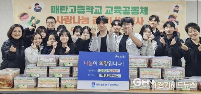 경기헤드뉴스 권준형 기자 | 매탄고등학교는 지난 19일, 교사·학생·학부모가 함께 참여해 마련한 김장김치 26박스를 매탄3동행정복지센터에 전달하며 지역사회에 따뜻한 나눔을 실천했다.