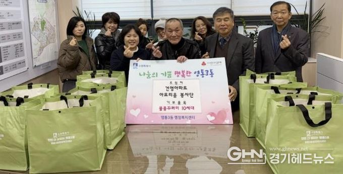 이강여 영통3동장은 “어려운 이웃을 위해 따뜻한 나눔을 실천해주신 아모리움 자원봉사 단체에 깊이 감사드린다. 관내 취약계층을 위한 다양한 지원이 지속적으로 이루어질 수 있도록 힘쓰겠다”고 말했다.