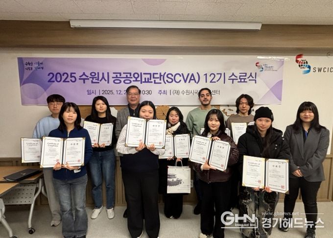 경기헤드뉴스 권준형 기자 | 수원시국제교류센터가 22일 센터에서 ‘수원시 공공외교단(SCVA) 12기’ 수료식을 열고, 단원 16명에게 수료증을 전달했다. 우수활동자 4명에게는 상장을 수여했다.