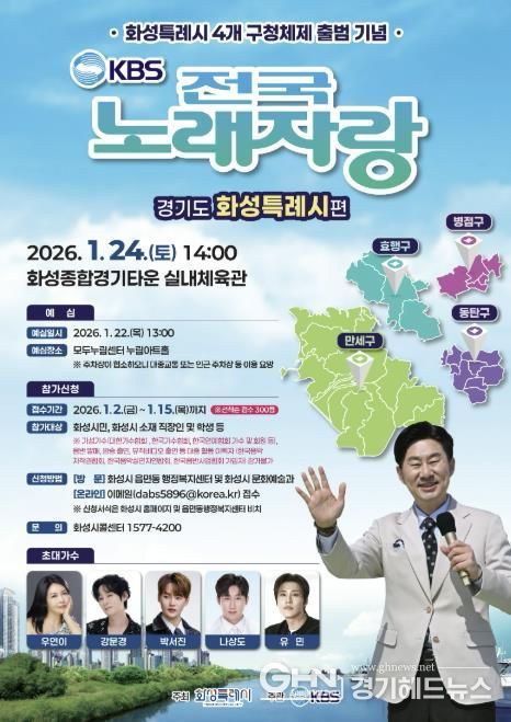 경기헤드뉴스 임채헌 기자 | 화성특례시는 다음 달 2일부터 15일까지 ‘KBS 전국노래자랑’ 화성특례시편 참가자를 모집한다고 24일 밝혔다.