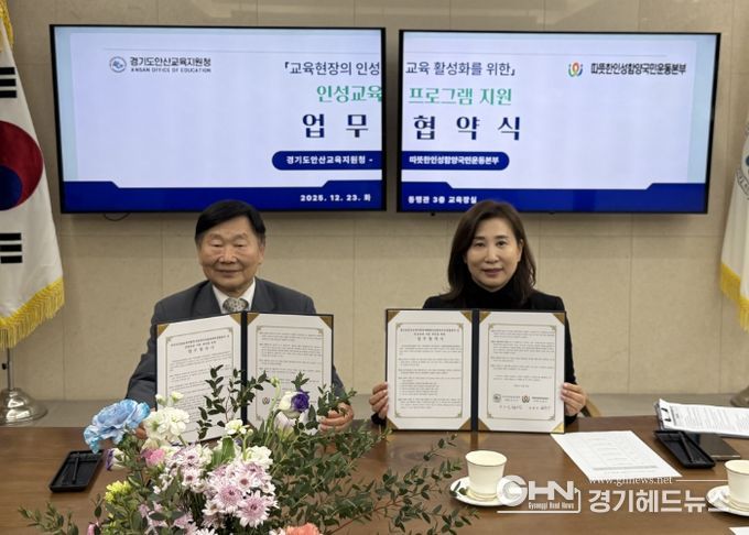경기헤드뉴스 임채헌 기자 | 경기도안산교육지원청은 12월 23일 오후 3시 30분, 따뜻한인성함양국민운동본부와 학교 현장의 인성교육 강화와 도덕성 회복을 위한 지역 연계형 인성교육 지원 체계 구축을 위한 업무협약(MOU)을 체결했다.