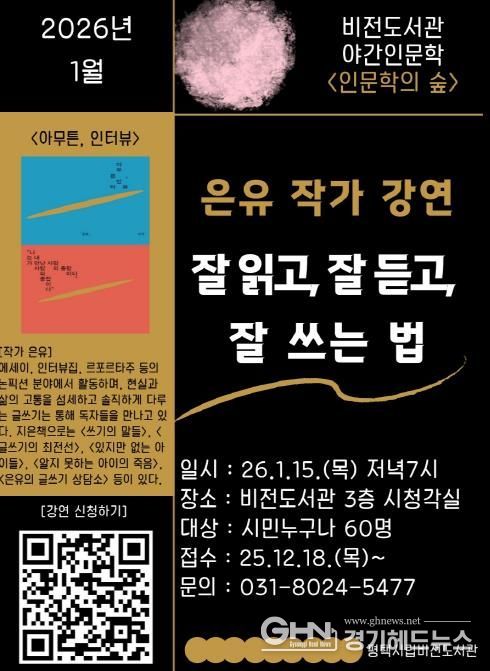 경기헤드뉴스 임수연 기자 | 평택시 비전도서관은 다음 달 1월 15일 저녁 7시 은유 작가를 초청하여 ‘잘 읽고, 잘 듣고, 잘 쓰는 법’을 주제로 야간 인문학 강연을 진행한다.