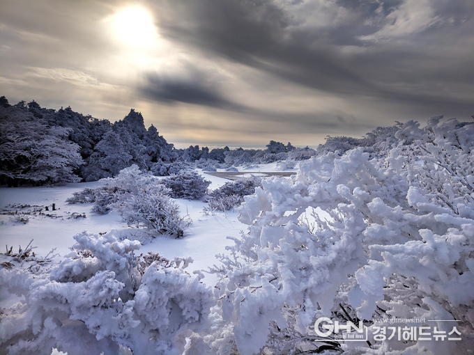 그윽하게 휘감기는 햇빛과 구름 아래 하얗게 눈이 내린 아름다운 풍경을 촬영한 사진으로
