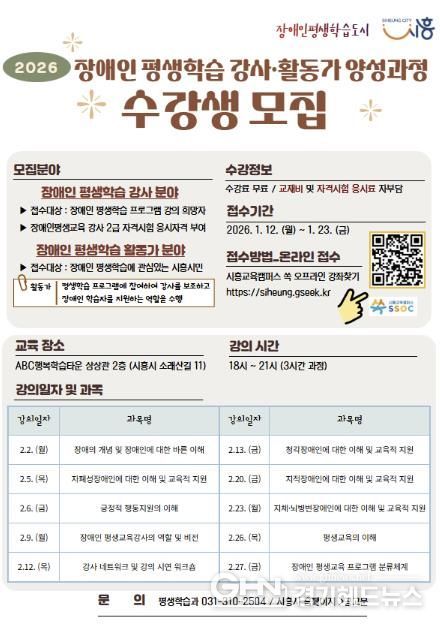 경기헤드뉴스 임채헌 기자 | 시흥시는 오는 1월 23일까지 ‘2026년 장애인 평생학습 전문 강사와 활동가 양성 과정’ 수강생을 모집한다.