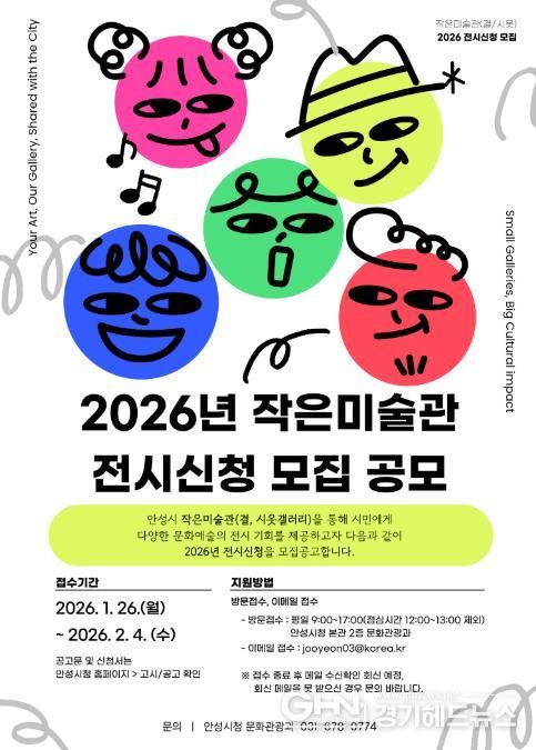 경기헤드뉴스 임수연 기자 | 안성시는 이달 26일부터 2월 4일까지 ‘안성시 작은미술관(결·시옷갤러리) 전시 신청 모집 공모’을 개최한다고 밝혔다.