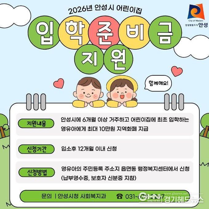 경기헤드뉴스 이현규 기자 | 안성시는 2026년부터 어린이집 입학준비금 지원사업을 시행한다고 밝혔다.