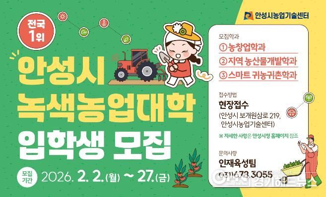 시 관계자는 “현장·창업·실무 중심 교육으로 안정적 영농 전문가를 양성한다”며 “관내 농업인들의 많은 참여를 부탁드린다”고 밝혔다. 안성시 녹색농업대학은 2025년 농촌진흥청 평가에서 전국 1위를 차지한 바 있다.
