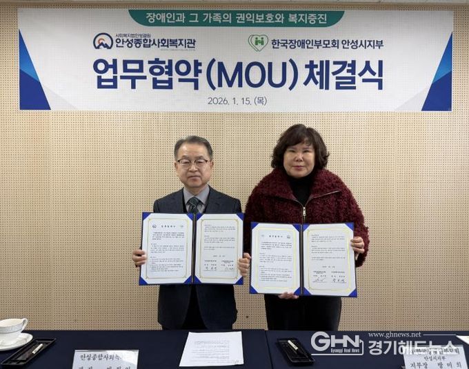 경기헤드뉴스 이현규 기자 | 안성종합사회복지관은 지난 15일 (사)한국장애인부모회 안성시지부와 장애인·가족 권익 보호 및 복지 증진을 위한 업무협약(MOU)을 체결했다.