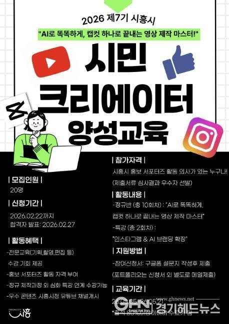 경기헤드뉴스 임채헌 기자 | 시흥시는 시민 참여형 홍보를 활성화하고 시민이 만드는 콘텐츠를 발굴ㆍ확산하기 위해 ‘2026 제7기 시민 크리에이터(창작자) 양성 교육’을 운영하는 가운데 참가자 20명을 2월 2일부터 22일까지 모집한다.