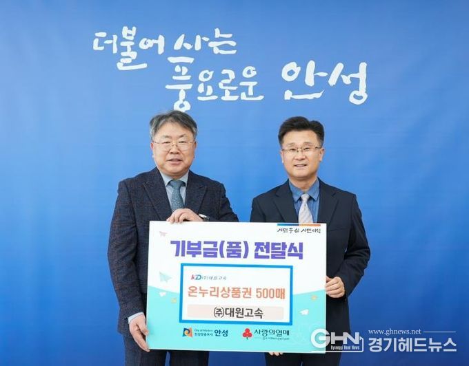 경기헤드뉴스 이현규 기자 | 안성시는 2월 3일 대원고속으로부터 지역의 어려운 이웃을 돕기 위한 온누리상품권 500매(500만 원 상당)를 전달받았다고 밝혔다.