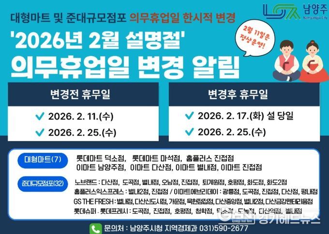 경기헤드뉴스 권민성 기자 | 남양주시는 설 명절을 맞아 관내 대형마트와 일부 준대규모점포(SSM)의 의무휴업일을 기존 2월 11일(수)에서 설 당일인 17일(화)로 한시적 변경 운영한다고 5일 밝혔다.