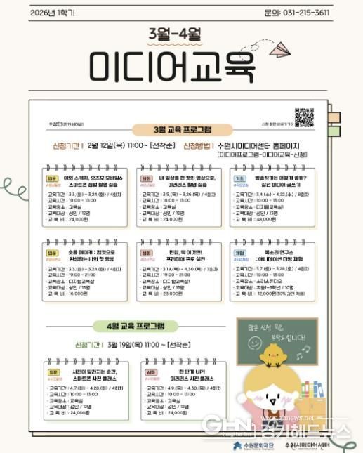 경기헤드뉴스 권준형 기자 | 수원문화재단 수원시미디어센터는 다가오는 봄, 시민들의 미디어 제작 역량을 깨우기 위한 2026년 3~4월 미디어 교육을 개설하고 수강생 모집에 나선다.
