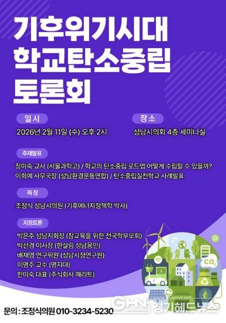 경기헤드뉴스 권준형 기자 | 기후위기 대응과 학교 현장의 탄소중립 실천 방안을 논의하기 위한 '기후위기 시대 학교 탄소중립 토론회'가 오는 2026년 2월 11일 오후 2시, 성남시의회 4층 세미나실에서 열린다.