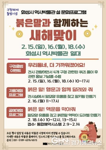 경기헤드뉴스 임수연 기자 | 화성특례시는 설 연휴 기간인 오는 2월 15일부터 18일까지 화성시 역사박물관에서 ‘붉은 말과 함께하는 새해맞이’ 설날 문화프로그램을 운영한다.