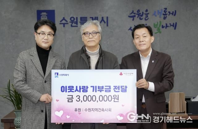 이웃돕기성금 300만 원은 수원지역건축사회 회원 137명이 모금해 마련했다. 수원지역건축사회는 2024년에도 이웃돕기성금 300만 원을 기부한 바 있다.