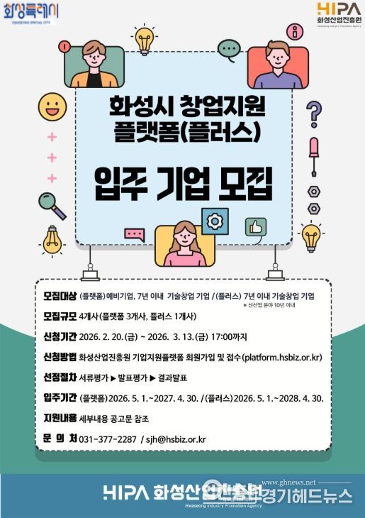 경기헤드뉴스 임수연 기자 | 화성산업진흥원(원장 전병선)은 동탄2 인큐베이팅센터 내 창업보육센터 ‘창업지원플랫폼’과‘창업지원플랫폼 플러스’ 입주기업을 오는 3월 13일까지 모집한다고 밝혔다.