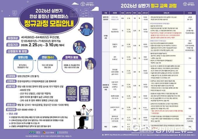 경기헤드뉴스 이현규 기자 | 안성 중장년 행복캠퍼스(한경국립대학교 평생교육원)는 2월 25일부터 3월 10일까지 ‘2026년 정규교육과정’ 수강생을 모집한다고 밝혔다.
