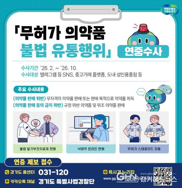 경기헤드뉴스 성미연 기자 | 경기도 특별사법경찰단(특사경)이 비대면 유통망 확산을 틈타 급증하고 있는 무허가 전문의약품 불법 유통 근절을 위한 집중 수사에 나선다.
