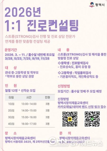 경기헤드뉴스 이현규 기자 | 평택시가 지역 내 청소년들의 진로 탐색 및 맞춤형 진로 설계를 위해 2026년도 1:1 맞춤형 진로 상담(컨설팅)을 운영한다.