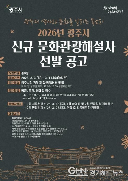 경기헤드뉴스 권민성 기자 | 광주시는 2026년도 광주시 문화관광 해설사 신규 선발을 위해 오는 3월 3일부터 11일까지 원서 접수를 실시한다고 25일 밝혔다.