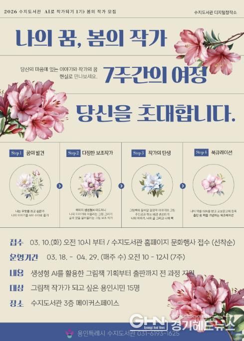 경기헤드뉴스 성미연 기자 | 용인특례시 수지도서관은 오는 3월 18일부터 운영하는 시민 작가 양성 프로그램 ‘나의 꿈이 책이 되는 7주간의 여정, AI로 그림책 작가 되기’ 1기 참여자를 모집한다고 27일 밝혔다.