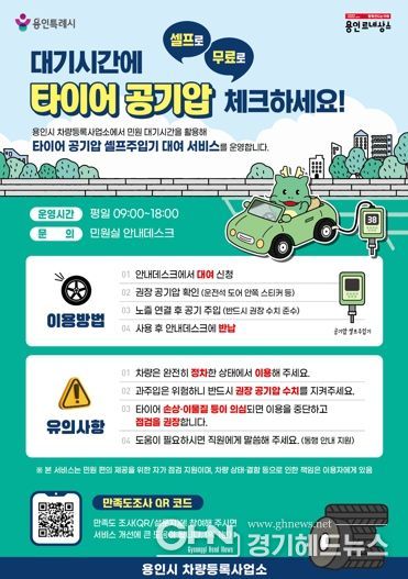 경기헤드뉴스 성미연 기자 | 용인특례시는 차량등록사업소를 방문하는 시민의 안전운전과 민원 편의 증진을 위해 ‘타이어 공기압 셀프 주입기 대여 서비스’를 운영한다고 2일 밝혔다.