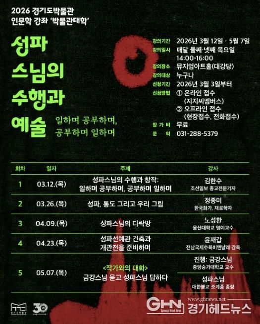 경기헤드뉴스 성미연 기자 | 경기도박물관은 오는 3월 12일부터 ‘2026 경기도박물관 박물관대학(인문학 강좌)’을 운영한다. 경기도박물관 박물관대학(인문학 강좌)은 매년 역사·문화와 관련한 시의성 있는 주제를 선정해 도민에게 제공하는 교육프로그램이다.