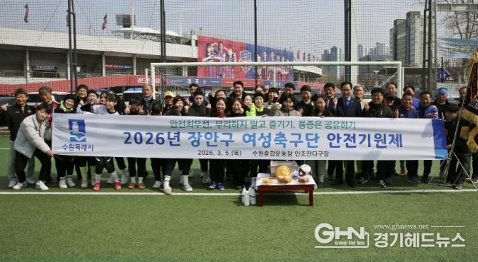 경기헤드뉴스 권준형 기자 | 수원시 장안구 여성축구단은 지난 5일, 수원종합운동장 인조잔디구장에서 선수단과 관계자 등 30여 명이 참석한 가운데 2026년 안전기원제를 진행했다.