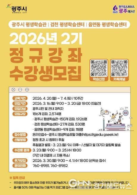 경기헤드뉴스 권민성 기자 | 광주시는 오는 16일부터 20일까지 2026년 제2기 평생학습 프로그램 수강생을 모집한다고 6일 밝혔다.