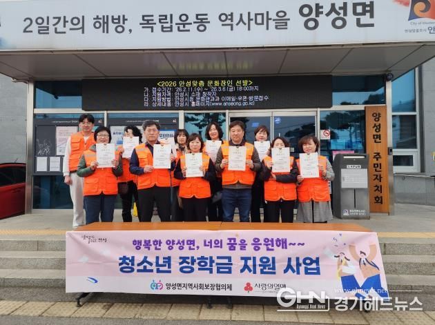 ‘청소년 장학금 지원 사업’은 양성면 아동‧청소년이 건강하게 성장하고 미래에 대한 희망을 키울 수 있도록 돕기 위해 추진되고 있으며, 이번 지원으로 11명에게는 2026년 3월부터 12월까지 매월 10만 원씩(총 100만 원), 2명에게는 2027년 2월까지 매월 10만 원씩(총 120만 원) 지원하며, 총 13명에게 1,440만 원의 장학금이 전달될 예정이다.