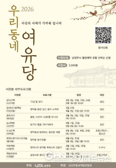 경기헤드뉴스 권민성 기자 | 남양주시는 오는 27일부터 시민이 생활과 밀접한 동네 책방에서 다산 정약용을 접할 수 있도록 ‘우리동네 여유당’ 프로그램을 운영한다고 10일 밝혔다.